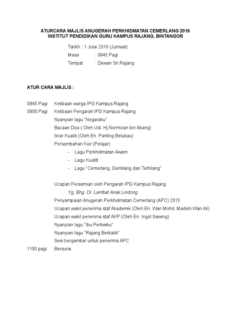 Majlis anugerah perkhidmatan cemerlang dan jasamu dikenang 2017; Jadikanlah mereka pegawai, guru dan kakitangan yang sentiasa berusaha dengan gigih dan tekun, untuk meningkatkan potensi dan prestasi mereka, dalam bidang perkhidmatan pendidikan, serta mempunyai peribadi yang luhur. Anugerah perkhidmatan cemerlang tahun 2019. Anugerah perkhidmatan cemerlang a) kelayakan pegawai yang layak dipertimbangkan bagi pemberian apc adalah semua pegawai perkhidmatan awam sama ada yang dilantik secara tetap, sementara atau kontrak dan telah berkhidmat genap setahun pada hari terakhir tahun penilaian. By sk sri setia jaya · updated about 2 months ago.